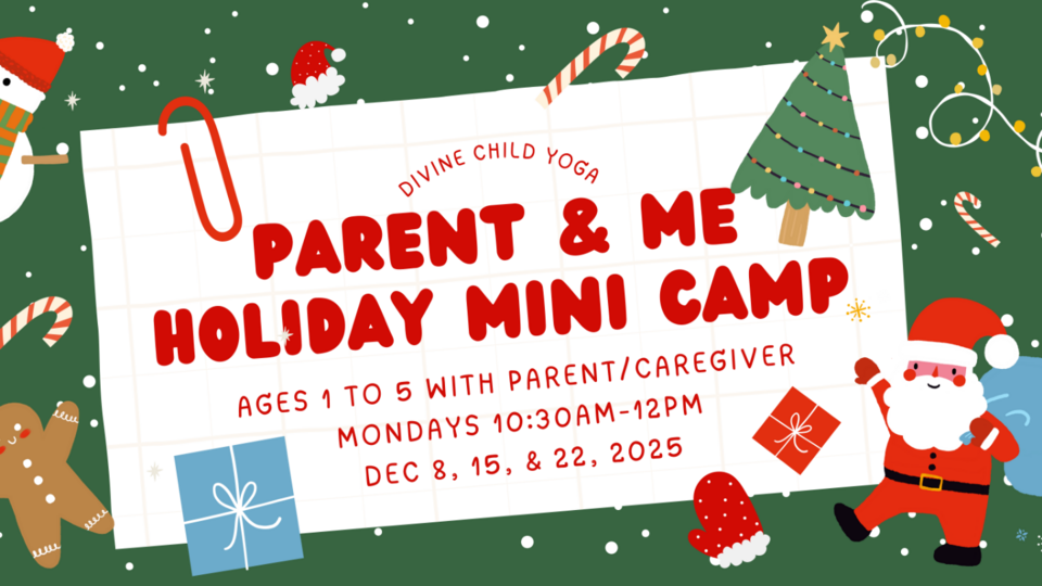 Join us for a holiday-themed yoga mini camp designed for ages 1-5 and their grown-ups — a joyful space to move, play, and be mindful together! With hustle and bustle of the season, give yourself and your little one the gift of presence and make holiday memories through yoga, movement, & festive fun! ✨